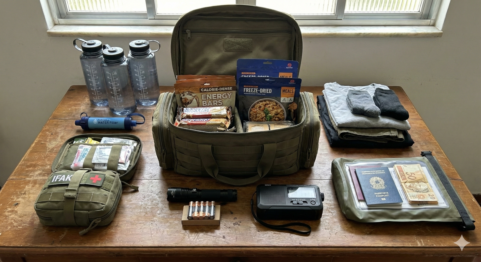O essencial inclui: 3 litros de água (ou filtros), alimentos calóricos prontos para consumo, kit de primeiros socorros (IFAK), lanterna com pilhas extras, rádio a pilha, muda de roupa seca, documentos em saco estanque e dinheiro vivo.