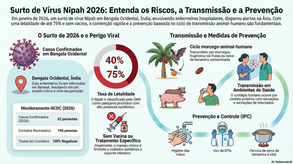 Fontes: Protocolo de Resposta Epidemiológica: Gestão de Surtos Hospitalares de Vírus Nipah (NIV) – NCDC/OMS, Jan 2026.